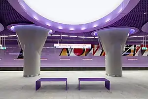 The station fully opened for passenger use on 8 March 2015 as part of the inaugural stretch of Line M2 between Rondo Daszyńskiego and Dworzec Wileński.[1][2] It was designed by Polish architect Andrzej M. Chołdzyński and constructed by Metroprojekt.[3] Murals were created by Wojciech Fangor, artist of the Polish School of Posters.