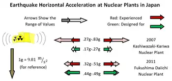 Between 2005 and 2007, three Japanese nuclear power plants were shaken by earthquakes that far exceeded the maximum peak ground acceleration used in their design.[84] The tsunami that followed the 2011 Tōhoku earthquake, inundating the Fukushima I Nuclear Power Plant, was more than twice the design height,[85] while the ground acceleration also slightly exceeded the design parameters.[86]