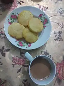 Nunor Bora (Bengali: নুনর বড়া), also known as Nungora, Nunor Fita, Nuner Bora, Lobonor Fita, and Lobonor Bora is a savoury rice flour snack made of onion, ginger and turmeric that gives the snack its golden appearance.[1] It is also known as Nuniya Pitha in Bangladesh. It is a traditional and a popular Pitha in Sylhet.[2][3][4] It is eaten with tea as a snack and is very popular at Eid[5]