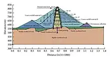 Nuozhadu Dam (Chinese: 糯扎渡大坝; pinyin: Nuòzhādù Dàbà) is an embankment dam on the Lancang (Mekong) River in Yunnan Province, southwest China. The dam is 261.5 m (858 ft) tall, and creates a reservoir with a normal capacity of 21,749,000,000 m3 (17,632,000 acre⋅ft) at a level of 812 m (2,664 ft) asl. The purpose of the dam is hydroelectric power production along with flood control and navigation. The dam supports a power station with nine generators, each with generating capacity of 650 MW. The total generating capacity of the power station is 5,850 MW.[2] Construction on the project began in 2004; the dam's first generator went online 6 September 2012 and the last generator was commissioned in June 2014.[3][4] The construction and management of the project was implemented by Huaneng Power International Ltd., which has a concession to build, own and operate hydroelectric dams on China's stretch of the Mekong River.
