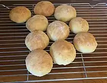 The 'base' of the bread is made from a blend of white and whole wheat flour mixed with yeast and a non-fat dried milk powder, although banana flour and coconut may also be used.[2] In the Philippines, the bread may be fortified with soy flour as a protein source,[3] or – as reported in 2019 – moringa leaf powder, squash, eggs, sugar, and salt may be used as main ingredients,[4][5] with attention given to flavor and texture to avoid organoleptic problems.[3] The wheat, milk, soy, moringa, and egg ingredients supply micronutrients, such as calcium, iron, and B vitamins.[3] The bun is made with iodized salt as a means of supplying iodine and sodium to the diet.[4] Each bun weighs 80 grams and contains 400 calories.[3][4]