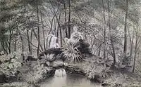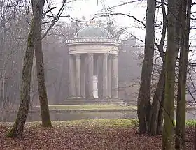 The largest area of the park is occupied by the English-style landscape garden. The northern part is defined by panoramic vistas of the Pagodenburg Lake with the Pagodenburg and the Pagodenburg valley, A meadow valley is running to the north with a brook, that flows into the Kugelweiher pond. The southern part is even more diverse with a panoramic vista of the large Badenburg Lake, It allows visitors views of the water surface at the Apollo temple (built in the form of a monopteros) and the Badenburg, behind which a wide meadow valley, called the Löwental (Lion Valley) leads to the south, as well as to a hamlet, the Amalienburg and the Crown Prince Garden south of the Great Parterre.[9][28]