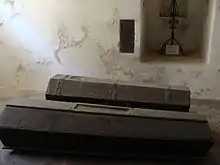 The entrance to the crypt beneath the chapel is covered with large boards. The two coffins along the wall contain the remains of Stanisław's father and uncle.[6] Four others were placed in small niches, the smallest coffin indicating the deceased was a child. The centre of the crypt houses the coffins of Anna and Stanisław.[6]