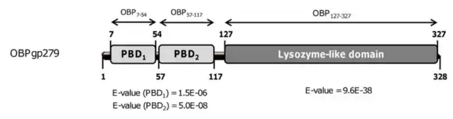 The catalytic domain of the enzyme resides on the C-terminal region of the enzyme. OBPgp279 is also predicted to contain peptidoglycan binding domains; since OBPgp279 contains two peptidoglycan binding domain motifs in its N-terminal region (general sequence motif = D-G-(Pho)2-G-K/N-G/N-T, Pho = hydrophobic amino acid), it likely contains two peptidoglycan binding domains as shown in the schematic drawing below.[1][8]