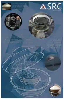 When the head was seated into the Sample-Return Capsule's capture ring on 28 October 2020, the spacecraft performed a "backout check", which commanded the TAGSAM arm to back out of the capsule. This maneuver is designed to tug on the collector head and ensure that the latches – which keep the collector head in place – are well secured. Following the test, the mission team received telemetry confirming that the head is properly secured in the Sample-Return Capsule. Thereafter, on 28 October 2020, two mechanical parts on the TAGSAM arm must first be disconnected – these are the tube that carried the nitrogen gas to the TAGSAM head during sample collection and the TAGSAM arm itself. Over the next several hours, the mission team commanded the spacecraft to cut the tube that stirred up the sample through the TAGSAM head during sample collection, and separate the collector head from the TAGSAM arm. Once the team confirmed these activities were done, it commanded the spacecraft on 28 October 2020, to close and seal the Sample-Return Capsule, the final step of the sample stowage process of Bennu's samples.[63] To seal the SRC, the spacecraft closes the lid and then secures two internal latches. Additionally, on inspecting images, it was observed that a few particles had escaped from the collector head during the stowage procedure, but it was confirmed that no particles would hinder the stowage process, since the team was confident that a plentiful amount of material remains inside of the head, being more than the needed amount, 60 g (2.1 oz), that is, between 60 g (2.1 oz) and 2,000 g (71 oz). The sample of Bennu is safely stored and ready for its journey to Earth. Now that the collector head is secure inside the SRC, pieces of the sample will no longer be lost.[64]