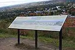The Panorama is an 84-inch (210 cm) panoramic photograph created by local photographer Tom Wall and set in acrylic on a steel stand in the cemetery's northwestern section. It sits at the edge of a bluff directly overlooking the grounds of Lansingburgh High School and Knickerbacker Middle School. The photograph spans a 100-mile (160 km) view and contains labels and notes—referred to by the Troy Cemetery Association as "cliff notes"—about the history of objects shown in the photograph.[42] From this point, one can view Albany and the Empire State Plaza (most notably the Corning Tower and Alfred E. Smith Building), the Helderberg Escarpment, South Troy, downtown Troy, Lansingburgh, Watervliet, Green Island, Cohoes, the Cohoes Falls, Waterford, the Hudson River, the confluence of the Mohawk and Hudson Rivers, and the eastern terminus of the Erie Canal. The Troy Cemetery Association claims that the view offers the "most concentrated and complete overview of American history anywhere in America".[5] It shows evidence of paleolithic rocks, Native Americans, the Dutch, the British, the French and Indian Wars, the American Revolution, the Industrial Revolution, and the "Way West" movement resulting in the creation of the Erie Canal and Champlain Canal.[5]