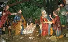 Traditionally, Armenians fast during the week leading up to Christmas avoiding all meat, eggs, and dairy products.[47] Devout Armenians may even refrain from food for the three days leading up to Christmas Eve, in order to receive the Eucharist on a "pure" stomach. Christmas Eve is particularly rich in traditions. Families gather for the Christmas Eve dinner (khetum, Խթում), which generally consists of rice, fish, nevik (նուիկ, a vegetable dish of green chard and chick peas), and yogurt/wheat soup (tanabur, թանապուր). Dessert includes dried fruits and nuts, including rojik, which consists of whole shelled walnuts threaded on a string and encased in grape jelly, bastukh (a paper-like confection of grape jelly, cornstarch, and flour), etc. This lighter menu is designed to ease the stomach off the week-long fast and prepare it for the rather more substantial Christmas Day dinner. Children take presents of fruits, nuts, and other candies to older relatives.[49] "On the eve of the Feast of the Nativity and Theophany of The Lord Jesus Christ, the Jrakalouyts Divine Liturgy (the lighting of the lamps service) is celebrated in honor of the manifestation of Jesus as the Son of God (theophany)"[50] In addition to the Christmas tree (tonatsar, Տօնածառ), Armenians (particularly in the Middle East) also erect the Nativity scene. Christmas in the Armenian tradition is a purely religious affair. Santa Claus does not visit the nice Armenian children on Christmas, but rather on New Year's Eve. The idea of Santa Claus existed before the Soviet Union and he was named kaghand papik (Կաղանդ Պապիկ), but the Soviet Union had a great impact even on Santa Claus. Now he goes by the more secular name of Grandfather Winter (dzmerr papik, Ձմեռ Պապիկ).