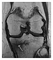 The diagnostic performance of MRI in the detection of occult fractures has been shown to be comparable, or better than MDCT. Indeed, while the specificity of both CT and MRI for the diagnosis of fracture can be as high as 100%, the sensitivity was reported to be higher for MRI. The superiority of MRI over any other imaging modality including MDCT for the detection of occult hip fractures is now recognised. For instance, an occult intertrochanteric extension of a greater trochanter fracture can be most effectively appreciated on MRI Moreover, MRI is extremely helpful in detecting associated soft tissue abnormalities, especially ligamentous lesions. MRI is now considered as the standard in this context. However, because of its relative unavailability in emergency settings and high costs, MRI may only be performed in "high risk patients" with negative X-rays. For example, when a hip occult fracture is suspected, patients with reduced baseline mobility and pain on axial compression are considered at risk and, therefore, should be examined by MRI. MRI signs of occult fractures are evident several weeks before radiographic signs appear. In the hip, a limited and cost-effective MR protocol, with only T1 weighted () coronal images, may enable a reliable diagnosis or exclusion of occult fracture in very little time, for example, 7 minutes. Typically, a linear hypointensity is observed on T1 W images. MRI is also highly sensitive to marrow abnormalities surrounding the fracture line, which appear as hypointensity on T1 W images and hyperintensity on fluid-sensitive sequences. Such signal changes are thought to be a combination of bone marrow edema, intraosseous haemorrhage, and/or granulation tissue and help to identify even undisplaced fractures. However, in the absence of a history of trauma and linear hypointensities on T1 W images, isolated bone marrow edema may represent other pathologies such as osteoid osteoma and sclerosing osteomyelitis.[1]