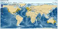 The production version of the OBIS Portal was launched at Rutgers University in 2002 as the web site http://www.iobis.org, serving 430,000 species-based georeferenced data records from 8 partner databases including fish records from FishBase, cephalopods from CephBase, corals from Biogeoinformatics of Hexacorals, mollusks from the Indo-Pacific Mollusc Database and more.[6] By May 2006, the OBIS Portal was able to access 9.5 million records of 59,000 species from 112 databases,[7] and by December 2010 (at the conclusion of the Census of Marine Life) provided access to 27.7 million records representing 167,000 taxon names.[8] As at July 2018, the OBIS website states that the system provides access to over 45 million observations of nearly 120,000 marine species (the reduced number of names cited being as a result of synonym resolution, i.e. reduction of taxa recorded under multiple names to a single accepted name), based on contributions from 500 institutions from 56 countries.[9]