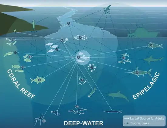 The diagram shows: (1) Larval and juvenile stages of fishes from many ocean habitats aggregate in slicks in order to capitalize on dense concentrations of prey (2, phytoplankton, 3, zooplankton, 4, larval invertebrates, 5, eggs, and 6, insects). The increased predator–prey overlap in slicks increases energy flow that propagates up the food-web (dotted blue lines show trophic links), enhancing energy available to higher trophic level predators (icons outlined in blue) including humans. More than 100 species of fishes develop and grow in surface slick nurseries before transitioning to adults (solid white lines radiating outward) in Coral Reefs (7–12), Epipelagic (13–15), and Deep-water (16–17) ocean habitats. As adults these taxa (icons outlined in white) play important ecological functions and provide fisheries resources to local human populations. For example, coastal schooling fishes (7, mackerel scad) are important food and bait fish for humans. Planktivorous fish (8, some damselfishes and triggerfishes) transfer energy from zooplankton up to reef predators like jacks (9),[103] which provide top-down control of reefs [104] and are important targets for shoreline recreational fisherfolk.[105] Grazers (10, chubs) help keep coral reefs from being overgrown by macroalgae.[106] Cryptobenthic fishes such as blennies (11) and benthic macrocrustaceans (12, shrimp, stomatopods, crabs) comprise most of the consumed biomass on reefs.[107][108] In the pelagic ocean, flyingfishes (13) channel energy and nutrients from zooplankton to pelagic predators such as mahi-mahi (14) and billfish (15), both of which utilize slicks as nursery habitat. Larvae of mesopelagic fishes like lanternfish (16) and bathydemersal tripod fishes (17) utilize these surface hotspots before descending to deep-water adult habitat.[98]