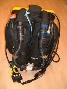 A backplate and wing is an alternative configuration of scuba harness with a buoyancy compensation bladder known as a "wing" mounted behind the diver, sandwiched between the backplate and the cylinder or cylinders. Unlike stabilizer jackets, the backplate and wing is a modular system, in that it consists of separable components. This arrangement became popular with cave divers making long or deep dives, who needed to carry several extra cylinders, as it clears the front and sides of the diver for other equipment to be attached in the region where it is easily accessible. This additional equipment is usually suspended from the harness or carried in pockets on the exposure suit.[29][30] Sidemount is a scuba diving equipment configuration which has basic scuba sets, each comprising a single cylinder with a dedicated regulator and pressure gauge, mounted alongside the diver, clipped to the harness below the shoulders and along the hips, instead of on the back of the diver. It originated as a configuration for advanced cave diving, as it facilitates penetration of tight sections of cave as, sets can be easily removed and remounted when necessary. The configuration allows easy access to cylinder valves, and provides easy and reliable gas redundancy. These benefits for operating in confined spaces were also recognized by divers who made wreck diving penetrations. Sidemount diving has grown in popularity within the technical diving community for general decompression diving,[31] and has become a popular specialty for recreational diving.[32][33][34]
