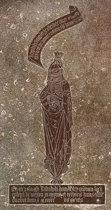 Between 1884 and 1886, the church was heavily restored under the direction of the architect E.G. Bruton. The bell tower and the north wall of the chancel were rebuilt, the vestry and north aisle were added and several windows inserted. Inside the church are two unusual monuments. The first is an early 16th-century monumental brass in memory of Ralph Hamsterley, who had been parish priest and died in 1518. It is a cadaver monument, showing his corpse in its burial shroud, which is a style unusual for monumental brasses in England. Elsewhere there is an example from the late 14th century, also in memory of a parish priest, in the parish church at Lytchett Matravers in Dorset.