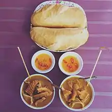 Papaitan, or sinanglaw in the Ilocos Region, is an offal stew whose signature ingredient is its broth made from animal bile and the fruit of the Averrhoa bilimbi. The original stew was made from goat offal or goat tripe, however, offal from cattle or carabao are also used. Papaitan means "bitterness", from the taste of the bile. In the province of Cagayan, a version of the dish without the bile is called menudencia. The dish kare-kare is made with beef tripe and tail stewed in peanut sauce. Beef tripe is also a main ingredient in a rice porridge dish called goto. Although, goto in the province of Batangas refers to a soup dish with the same tripe ingredient, instead of rice porridge. Beef tongue, on the other hand, is stewed in a creamy dish called lengua (Spanish for "tongue"). Beef liver, as well as pig liver, are also main ingredients in meat stews such as menudo, and the Ilocano igado (from "hígado" or Spanish for "liver").