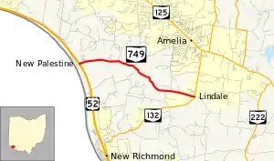 State Route 749 (SR 749) is an east–west state highway in the southwestern portion of the U.S. state of Ohio. Its western terminus is at a signalized intersection with US 52 in the hamlet of New Palestine, and its eastern terminus is at another signalized intersection, this time SR 132, in the unincorporated community of Lindale.