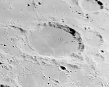 The interior of this crater has become flooded by basaltic lava, producing a nearly level, featureless surface with a low albedo. A number of tiny craterlets mark this surface, particularly in the northwest. The surrounding mountain ring has been eroded by impacts, and is somewhat distorted from a true circular shape. There is a wide bulge in the rim toward the southeast, where the surface is lower and more rugged. Slight bulges also exist to the southwest and northwest. The rim is marked by a number of tiny impacts along the edge, particularly to the southwest.