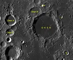 Oken is a lunar impact crater near the southeastern limb of the Moon. It is normally visible from the Earth, but is foreshortened and within the region of the surface that is subject to libration. To the south and east of this feature is the broad, uneven Mare Australe, which extends to the far side of the Moon.