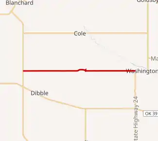 SH-126 first appears on the 1957 Oklahoma state highway map, implying it was added to the state highway system the year prior.[4] As of 1958, the highway in its entirety was composed of gravel.[5] By the following year, the east half of the highway had been paved.[6] The highway remained in this state until 1966, when it was removed from the state highway system and turned over to McClain County.[2][7]