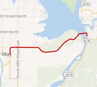 SH-251A begins in Wagoner County at SH-16 in Okay and follows North York Road north out of town.[3] Upon leaving town, the highway curves to the east. The highway proceeds due east until reaching the unincorporated settlement of Mallard Bay, where it curves to the southeast to avoid the eponymous bay. SH-251A curves back to the northeast, paralleling the short of Fort Gibson Lake, before reaching Fort Gibson Dam. The route crosses the Grand River along the top of the dam, entering Cherokee County in the process. After the SH-251A leaves the dam, it reaches its junction with SH-80 and ends.[4]