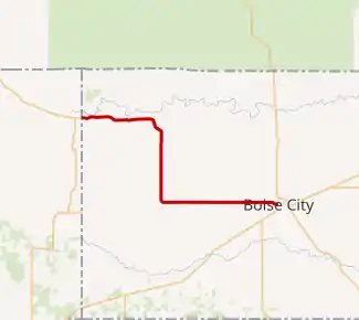 SH-325 heads south for about 12 miles (19 km), crossing the intermittent Cold Springs Creek. The road then turns east. The remainder of the route is a mostly flat, straight shot into Boise City, with a minor curve to the west of town where it crosses a railroad track. The route ends at the traffic circle surrounding the Cimarron County Courthouse in downtown Boise City.[2]