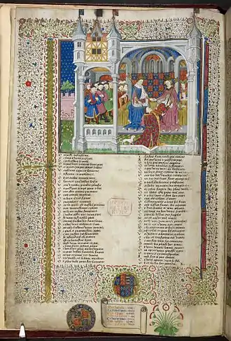 Many of Edward's manuscripts reflected this taste; like that of Philip, his court displayed an increase in ceremonial formality, and interest in chivalry. Most of his books are large-format popular works in French, with several modern and ancient histories, and authors such as Boccaccio, Christine de Pisan and Alain Chartier. They are too large to hold comfortably, and may have been read aloud from lecterns, though the large miniatures were certainly intended to be appreciated. The largest purchases were probably made from about April 1479, when a part-payment is recorded to a foreign ("stranger") "merchant" or dealer for £80 to "merchant stranger Philip Maisertuell in partie of paiement of £240 of certaine bokes by the said Philip to be provided to the kyngs use in the parties beyond the see." This was perhaps Philippe de Mazerolles, a leading illuminator who had moved from France to Flanders. At least six of Edward's Flemish books are dated to 1479 and 1480; such large books naturally took a considerable time to produce. Further payments totalling £10 are recorded in 1480 for binding eight books, for which other payments record the transport to Eltham in special pine chests.[15] Other manuscripts are no longer in the Royal collection, such as the "Soane Josephus" (MS 1, Sir John Soane's Museum), which remained in the collection until after an inventory in 1666.[16] One of the most splendid books made for Edward in Bruges in the 1470s is a Bible historiale in French in three volumes (Royal MS 15 D i, 18 D ix-x), which was probably begun for another patron, then completed for Edward.[17]