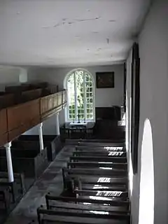 Before the alteration of the roof in 1813, the chapel would have had no ceiling and would have been open to the rafters, as can be seen from the height of the top of the east window. The pulpit was originally three-tier and was located against the north wall.[4]