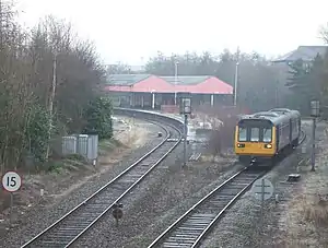In 1957, the main station building was rebuilt by British Railways.[3][4] This building was later demolished in the 1990s, and the station facilities were concentrated on the main island platform, which was reached by an underpass.[1] The station was reached across the dual-carriageway Oldham bypass, a difficult walk from the town centre.
