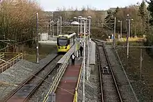 The "temporary" Oldham Mumps tram stop was used as an interim measure, while the new street running tram line through Oldham town centre was built, and was closed on 18 January 2014. Its closure allowed for a 1+1⁄2-mile (2.4 km) stretch of track which had run through the station to be permanently abandoned.[10]