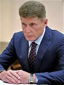 Oleg Nikolayevich Kozhemyako (Russian: Оле́г Никола́евич Кожемя́ко), born 17 March 1962, is the Governor of Primorsky Krai since 2018. Previously he was the Governor of Sakhalin Oblast, Russia. President Vladimir Putin appointed him to the position on March 25, 2015 to replace former Governor Alexander Khoroshavin who was arrested and charged with accepting bribes.[1] Previously, Kozhemyako served two terms as Governor of Amur Oblast and one term as the Head of Koryak Autonomous Okrug.
