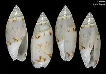 | Shell of Olivella exilis (specimen at MNHN, Paris) | |