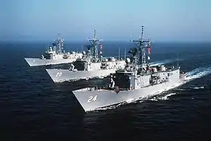 The Oliver Hazard Perry class is a class of guided-missile frigates named after the U.S. Commodore Oliver Hazard Perry, the hero of the naval Battle of Lake Erie. Also known as the Perry or FFG-7 (commonly "fig seven") class, the warships were designed in the United States in the mid-1970s as general-purpose escort vessels inexpensive enough to be bought in large numbers to replace World War II-era destroyers and complement 1960s-era Knox-class frigates. In Admiral Elmo Zumwalt's "high low fleet plan", the FFG-7s were the low capability ships with the Spruance-class destroyers serving as the high capability ships. Intended to protect amphibious landing forces, supply and replenishment groups, and merchant convoys from aircraft and submarines. They were also later part of battleship-centred surface action groups and aircraft carrier battle groups/strike groups.[1] Fifty-five ships were built in the United States: 51 for the United States Navy and four for the Royal Australian Navy (RAN). In addition, eight were built in Taiwan, six in Spain, and two in Australia for their navies. Former U.S. Navy warships of this class have been sold or donated to the navies of Bahrain, Egypt, Poland, Pakistan, Taiwan, and Turkey.