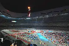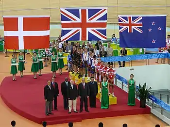 A medal ceremony is held after the conclusion of each Olympic event. The winner, and the second- and third-place competitors or teams, stand on top of a three-tiered rostrum to be awarded their respective medals by a member of the IOC.[161] After the medals have been received, the national flags of the three medallists are raised while the national anthem of the gold medallist's country is played.[162] Volunteering citizens of the host country also act as hosts during the medal ceremonies, assisting the officials who present the medals and acting as flag-bearers.[163] In the Summer Olympics, each medal ceremony is held at the venue where the event has taken place,[164] but the ceremonies at the Winter Olympics are usually held in a special "plaza".[165]