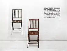 One and Three Chairs, 1965, is a work by Joseph Kosuth. An example of conceptual art, the piece consists of a chair, a photograph of the chair, and an enlarged dictionary definition of the word "chair". The photograph depicts the chair as it is actually installed in the room, and thus the work changes each time it is installed in a new venue.