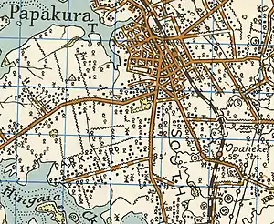 Ōpaheke railway station was a flag station serving Ōpaheke on the North Island Main Trunk in New Zealand.[1][2] It was opened in 1875[3] and closed in 1955.[4] It was called Hunua until 7 January 1912 and, though it didn't appear in the 1875 timetable,[5] Hunua was described as a small wayside station on the line's opening day.[6] The station was first listed in the December 1875 timetable, being served by 2 trains a day, taking 92 minutes for the 21 mi (34 km) from Auckland.[7] When the line was extended to Hamilton, Hunua gained an extra train and the schedule was cut to 79 minutes.[8]