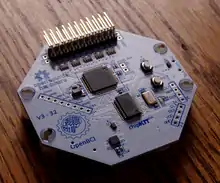 The OpenBCI 32bit Board uses the ADS1299, an IC developed by Texas Instruments for biopotential measurements.[2] The OpenBCI uses a microcontroller for on-board processing — the 8bit version (now deprecated) uses an Arduino-compatible ATmega328P IC, while the 32bit board uses a PIC microcontroller — and can write the EEG data to an SD card, or transmit it to software on a computer over a bluetooth link.