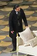 In 1908 (January, 12), the first mugham opera staged at the theater of Zeynalabdin Taghiyev was a great success.[12] Famous classic story and mugham were joined in this opera. Leyli and Majnun became the first mugham opera in Azerbaijan. Zulfugar Hajibayov Ashig Garib (1916) and Shah Ismayil by Muslum Magomayev (1916) are significant examples of this genre. This tradition was continued by composers in the second half of the 20th century. Shafiga Akhundova's Gəlin qayası (Bride rock) and Jahangir Jahangirov's Xanəndə taleyi (The fate of singer) are examples of operas by these composers.[13]