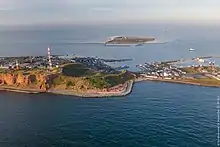 The island survived the blast, but the southern tip of the island, the rubble of which makes up today's Mittelland, was blown away.[7] Parts of the cliff also collapsed, and countless craters were created. However, the harbor facilities and coastal protection walls remained intact; the spared civil air raid shelters today attract up to 10,000 tourists annually. The only building to survive the blast was the Flakturm, today's Heligoland Lighthouse.[8] The detonation could be registered seismographically in Germany and used to study the earth's crust.[9] It was not until 1952, after protests by the residents, that the people of Heligoland were allowed to repopulate their island. Today, on the anniversary of the demolition, a memorial service is held in the civil defense bunker.