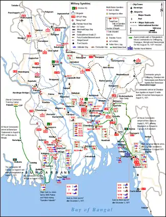 The Mukti Bahini Naval Commandos launched several sabotage efforts in the cities of Chittagong, Chandpur, Mongla, and the Narayanganj District against the operating combined forces of the Pakistan Soldiers, Pakistan Marines, Pakistan Navy SEAL Teams, and the East Pakistan Security Forces on the night of 15 August 1971.[4][5] Bengali Submariners who had defected from Pakistani submarine PNS Mangro (S133), then based in Toulon in France, led the attacks, and this is also known as Operation Jackpot.[6] Pakistani military initiated countermeasures to improve security by increasing the door-to-door clearance and the applied counterinsurgency tactics by the Army Special Forces and the Navy SEAL Teams, but this failed to curb the Mukti Bahini activity.[7]