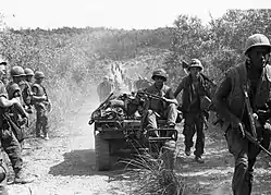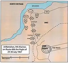 2/9 Marines, supported by a platoon of five M-48s, three M50 Ontos and three LVTEs moved north along Provincial Route 606 to make a spoiling attack into the DMZ, the unit made no contact with the PAVN and set up a night defensive position near the Bến Hải River[4] The following morning as the unit was returning along the same route a command detonated mine exploded wounding 5 Marines. Further down the convoy, a second mine was detonated.[4] The PAVN then opened fire with small arms and mortar fire and attacked the armored vehicles with RPG-2 rockets. The PAVN attempted to hug the US column negating the use of air support and the column broke up into several separate firefights. The convoy then retreated; only through the use of napalm support was the Marine convoy saved from a complete rout.[4] The isolated Marine companies set up night defensive positions and were eventually relieved by 3/4 Marines on the morning of 30 July. Marine casualties for the operation were 23 dead and 251 wounded, while 32 PAVN dead were counted by the Marines and a further 175 believed killed.[1]: 125–128