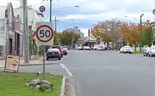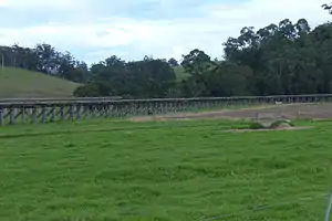 Orbost straddles the Princes Highway. A 567 metre bridge over the Orbost floodplain opened in November 1976.[7] The town was connected to Melbourne when the Gippsland railway line opened to Orbost station in 1916 principally carrying timber and farming produce. In the early days of the railway's operation dedicated passenger trains ran but these ceased by the 1930s. The line closed in 1987 when the line was cut back to Bairnsdale. The track infrastructure was dismantled in 1993/94.[8] The line traversed a mixture of farmland, hills and heavily forested country. It included numerous bridges, including the Stoney Creek Trestle Bridge, the largest of its kind in Victoria.[9] Public transport services are provided to the town by V/Line with road coach services from Batemans Bay, Marlo and Canberra to Bairnsdale that connect with train services to Melbourne.[10][11][12]