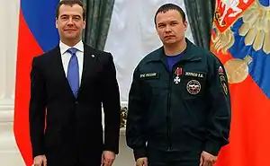 It may also be awarded to foreign nationals who showed dedication, courage and bravery in the rescue of Russian citizens during natural disasters, fires, accidents and other emergencies outside of the Russian Federation.[2]