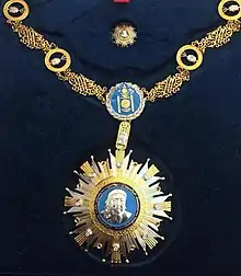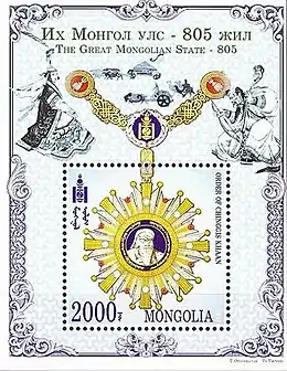 The Order of Genghis Khan (Mongolian: Чингис хааны одон, Chingis khaany odon) is a state award of Mongolia. It is currently the country's highest state award conferred for distinguished citizens of special merit. Criteria for receiving the award includes building and developing a democratic society, familiarizing other countries with Mongolian culture and/or art and promoting the name of Mongolian culture in the world.[1] It was introduced in May 2002 by President Natsagiin Bagabandi in honor of the 840th anniversary of the birth of the Great Khan of the Mongol Empire Genghis Khan.[2][3] A person who is awarded the order is given a sum equivalent to 35 grams of gold (around 235 Mongolian tögrög, 1,743 in US Dollars).[4]
