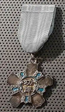 The Order was founded by the Guangxu Emperor on 7 February 1882 as an award for outstanding services to the throne and the Qing court. Originally it was awarded only to foreigners but was extended to Chinese subjects from 1908.[1] It was the first Western-style Chinese order, established in the wake of the Second Opium War as part of efforts to engage with the West and adopt Western-style diplomatic practices.[2] Traditionally the Chinese court did not have an honours system in the Western sense; however hat buttons, rank badges, feathers and plumes were routinely awarded by the Emperor to subjects and foreigners alike prior to and after the introduction of the Order of the Double Dragon.[3] The order was replaced in 1911 during the last days of the Qing dynasty by the Order of the Imperial Throne, although this replacement was never fully implemented and the Republic of China discontinued the imperial orders after its establishment in 1912.[3]