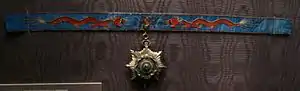 The order took on many different designs and forms until its abolition in 1911. Gradations were distinguished most commonly by differentiation in the type and size of precious stones inlaid, the shape of the medallion, the length of the ribbon, and the material used to construct the medallion. Gold and pearl were reserved for the higher classes, enamel and coral for the lowest classes.[4] The original designs were similar in style and appearance to traditional Chinese insignia, but they proved cumbersome for many to wear and in 1897 they were redesigned in the form of a Western-style breast-badge, although the original designs were still awarded for some time afterwards.[5] Similar symbolic motifs accompanied all designs over the award's history, most notably two dragons surrounding a central precious stone and flames which were connotative symbols of imperial authority. Other symbols of imperial authority - mountains, clouds, plum blossoms and characters with providential meanings - were added to variations of the designs over time.[6]