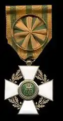 • The badge of the order is a gilt cross pattée, enamelled in white; the Officer class has a green enamelled oak wreath between the arms of the cross. The central disc bears the crowned monogram "W" (for William) on a green enamel background.