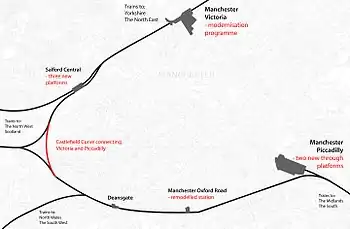 Network Rail submitted the Transport and Works Act application to construct the Ordsall Chord in September 2013.[24] The statutory instrument authorising construction was made on 31 March 2015,[25] and preparatory works began in October 2015. In January 2016, Network Rail began work on the foundations with a planned completion date of late 2017.[26] In November 2016, Network Rail announced they expected services to run to Manchester Airport from December 2017 and electric trains to run between Manchester and Preston via Bolton with new connections into Manchester from the Calder Valley. 2018 will see the introduction of an hourly direct service from Newcastle to Manchester Airport, which will also mean an extra hourly service between Leeds and Newcastle, and six trains an hour between Manchester Victoria and Rochdale.[27]