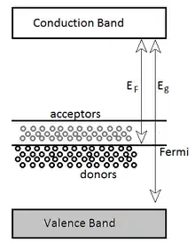 where NC and NV are the densities of states at the bottom of the conduction band and the top of the valence band, respectively, EC and EV are the corresponding energies, EF is the Fermi level, kB is Boltzmann's constant and T is the absolute temperature. Addition of impurities into the semiconductor, or doping, produces excess holes or electrons, which, with sufficient density, may pin the Fermi level to the impurities' position.[6]