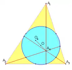 The incenter of this common orthic triangle must be one of the original four orthocentric points. Furthermore, the three remaining points become the excenters of this common orthic triangle. The orthocentric point that becomes the incenter of the orthic triangle is that orthocentric point closest to the common nine-point center. This relationship between the orthic triangle and the original four orthocentric points leads directly to the fact that the incenter and excenters of a reference triangle form an orthocentric system.[2]: p.182