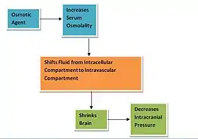 Osmotic agents work by primarily affecting the blood brain barrier.[1] It's very important that the osmotic agents cannot cross the blood brain barrier because the main idea is to use osmotic agents to increase plasma osmolarity and cause an osmotic gradient to cause water from brain cells to flow into the plasma. Once the equilibrium is reached, both the ICP and intracellular volume return to their initial normal conditions.[3] An ideal osmotic agent would be characterized by its inertness, relative non-toxicity and complete exclusion from brain entry. Thus, osmotic agents with reflection coefficient (σ) closer to 1 (0= freely permeable, 1= completely impermeable) is preferred as it is not likely to exhibit any rebound effects such as cerebral edema and ICP elevations upon withdrawal. Commonly used osmotic agents are urea, glycerol, mannitol and Hypertonic Saline.[1] Dosage of osmotic agent administration is referred to as grams per person's body mass (g/ kg).[3]