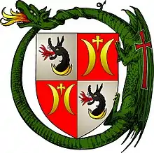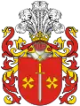 Ostoja is a Polish coat of arms that probably originated from Sarmatian Tamga[1][2] and refer to Royal Sarmatians using Draco standard. Following the end of the Roman Empire, in the Middle Ages it was used by Ostoja family in Lesser Poland and later also in Kujavia, Mazowsze and Greater Poland.[3] It is a coat of arms of noble families that fought in the same military unit using battle cry Hostoja or Ostoja, and that applied their ancient heritage on the Coat of Arms, forming a Clan of knights. Later, when the Clan expanded their territory to Pomerania, Prussia, Slovakia, Hungary and Romania they also adopted a few noble families of Ruthenian origin that in 14-15th century settled down in Lithuania, Belarus and Ukraine, finally turning into the Clan of Ostoja. As different lines of the clan formed surnames after their properties and adding the adoptions, Ostoja was also recognized as CoA of several families that was not necessary connected to the original Clan, forming Heraldic clan.[4][5][6]