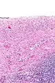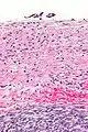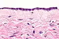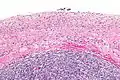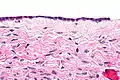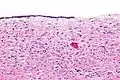 | Ovarian serous cystadenoma. The cystic space is at the top of the image. Ovarian parenchyma is seen at the bottom right. H&E stain. | |